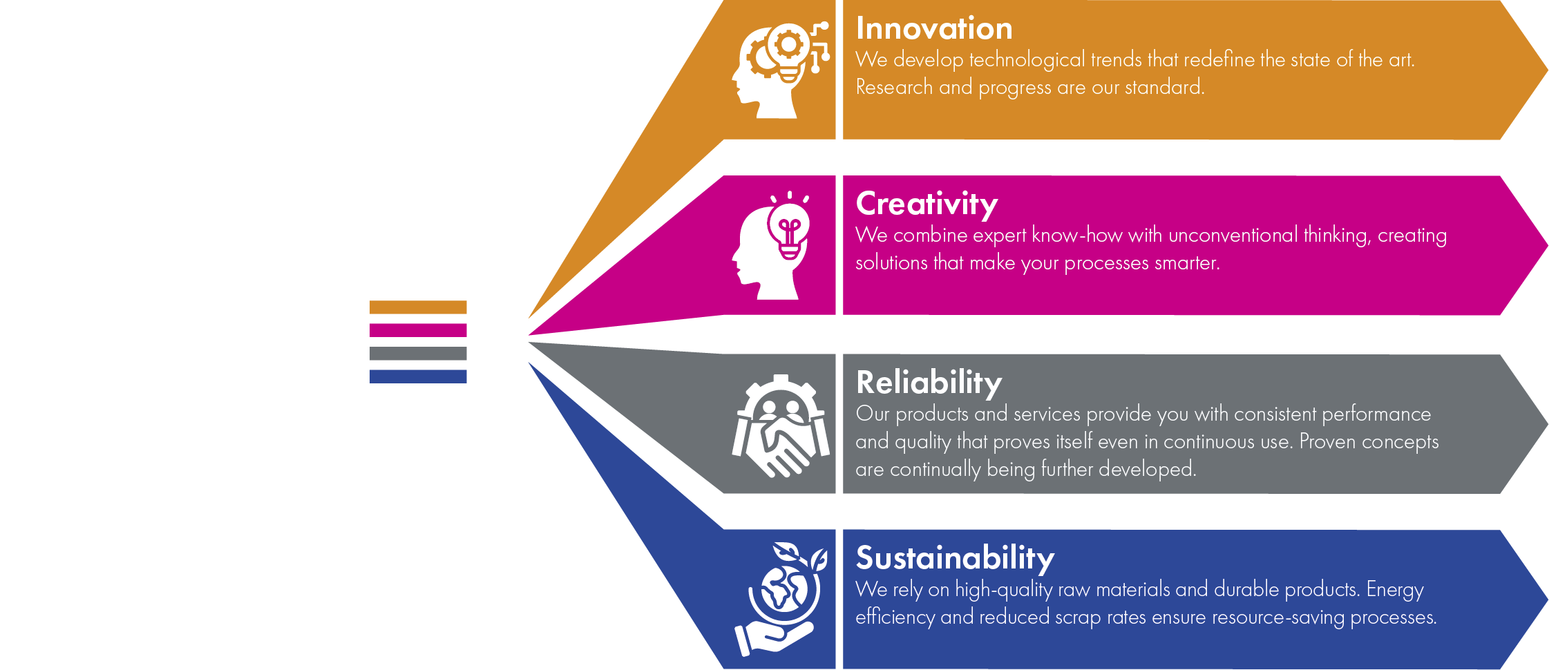 At the ABICOR GROUP, orange represents the courage to innovate, magenta represents boundless creativity, gray represents trust and reliability, and blue represents our commitment to sustainable thinking and action. Taken together, they represent our promise of a strong, future-oriented partnership – for our customers.